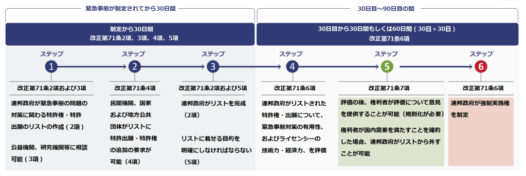 改正後の強制実施権の仕組みとして緊急事態が制定された日から30日以内に緊急事態の対策に有効な技術について、その理由を付けて強制実施権の対象とする特許のリストを公開しなければなりません。さらに、ブラジル国内のニーズに対応可能なライセンス契約の対象となる特許、およびLOR(ライセンス・オブ・ライト)の対象となる特許も当該リストに含めなければなりません。(改正第71条2項)。当該リストの作成に当たり、ブラジル連邦政府は公益機関、研究機関等に相談すべきとされています(改正第71条3項)。また、民間機関、国家および地方公共団体が当該リストに特許出願および特許権の追加を要求することができます(改正第71条4項)。公開後、ブラジル連邦政府は、30日以内(30日間延長可能)に、リストアップされた特許出願および特許権について評価を行い、ライセンシー候補のブラジルにおける製造に関する技術的および経済的能力の有無、そして、国家緊急事態に対応するための強制実施権の有用性の有無について判断されます(改正第71条6項)。ブラジル連邦政府は、特許権者および出願人が公衆衛生上の緊急事態の必要性に必要な量、価格、時期の条件で国内需要を満たすことを確約した場合、対応する特許および特許出願を上記リストから除外することができます。そのために、改正では(a)国内実施、(b)自発ライセンス、および(c)国内の販売、が認められます(改正第71条7項)。