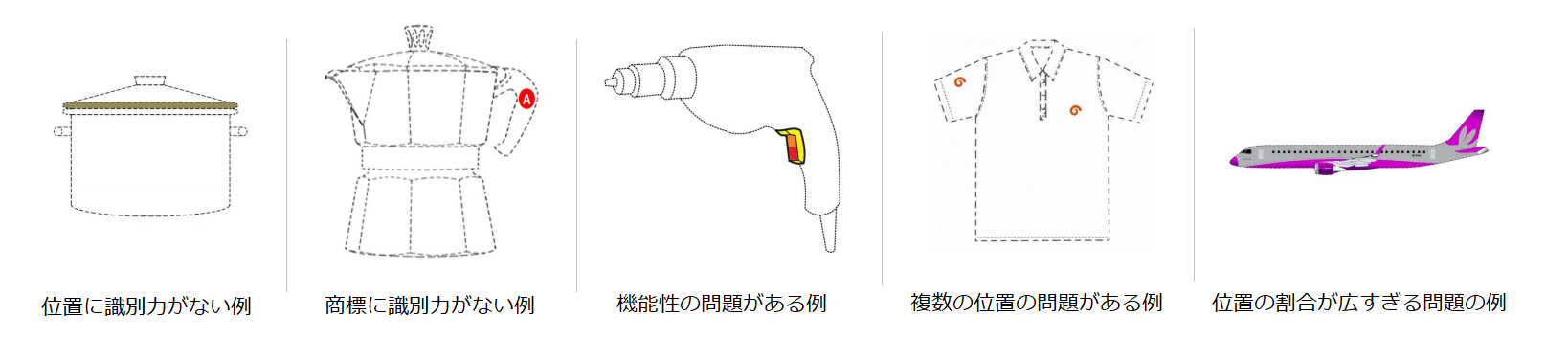 審査は、主に(a)標識の識別性と(b)位置の識別性の2つの要素が考慮されて行われます。例えば、鍋の蓋の縁に色を塗ることは、識別力の位置ではないとしています。別の例では、コーヒーメーカーのハンドルに一文字(例えば「A」)を使用することは、その標識に識別力がないため拒絶される。商標が装飾的としか判断されない場合は、その商標には識別力がないと判断されます。