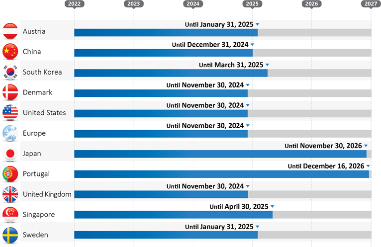 ブラジル特許庁(INPI)長官と日本特許庁長官は、2021年12月1日から5年間にわたる両庁間のPPH更新のための協力覚書に署名しました。また、2021年12月16日にポルトガル特許庁とブラジル特許庁は、5年間にわたりPPHを実施しますための覚書を締結しました。それによって、2021年12月現在、以下の11カ国との間でPPHが行われています。