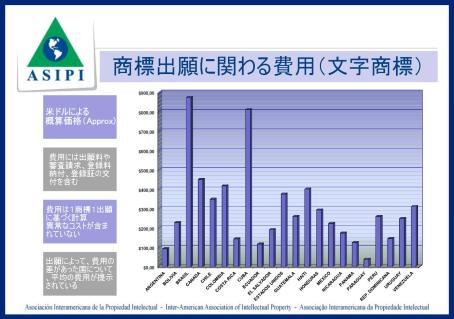 2011年から、ASIPI(米州知的財産協会)がアメリカ大陸における知的財産を権利化するためにいくらくらいの費用がかかるかという検査を行っている。後日に2011年に公開された2010年度についてのレポートについて述べようとしたが、商標出願について新しいレポートが今週、メンバーに公開された。